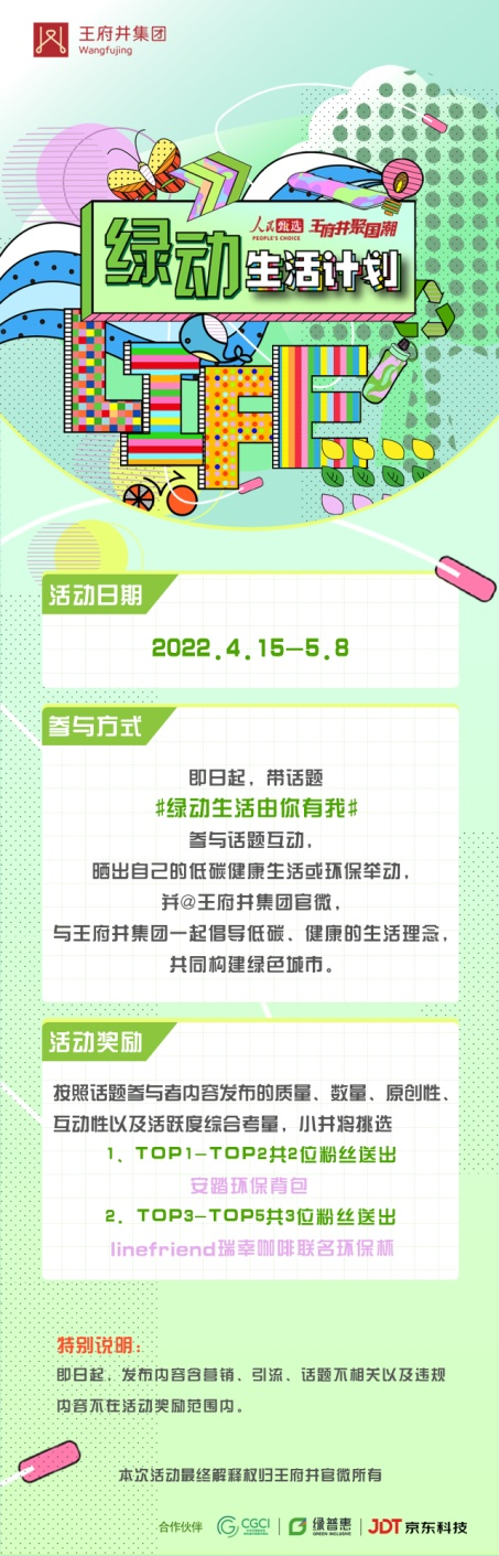 4月15日,由王府井集團發(fā)起,聯(lián)合人民創(chuàng)意、中華環(huán)保聯(lián)合會、綠普惠、京東科技等品牌機構共同參與,活動通過文化、環(huán)保、科技、消費等領域的強強聯(lián)合,開啟“向綠”模式,以“運動不止賽場 隨時綠動生活”為slogan,以“人民甄選·王府井聚國潮【綠動生活計劃】”為主題,在王府井集團全國35個城市的74家門店同步開啟,以實際行動踐行綠色發(fā)展理念,倡導綠色低碳健康生活,用低碳、健康的理念來引導品牌和消費者的行為,構建低碳共同體,讓綠色低碳成為經(jīng)濟高質量發(fā)展的亮麗底色。