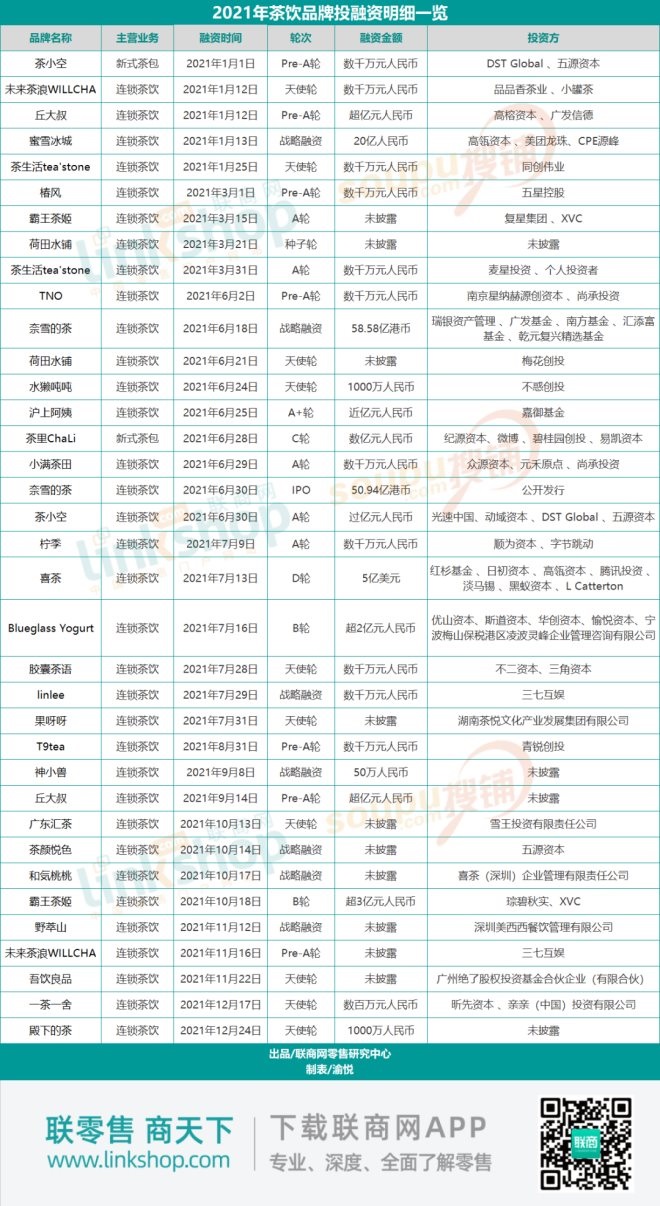 同時其他茶飲如丘大叔、蜜雪冰城、滬上阿姨、茶理chali、茶小空、喜茶、blueglassyogurt和霸王茶姬等8家品牌,在2021年期間共發(fā)生11次過億融資事件,融資總金額超過149億元。