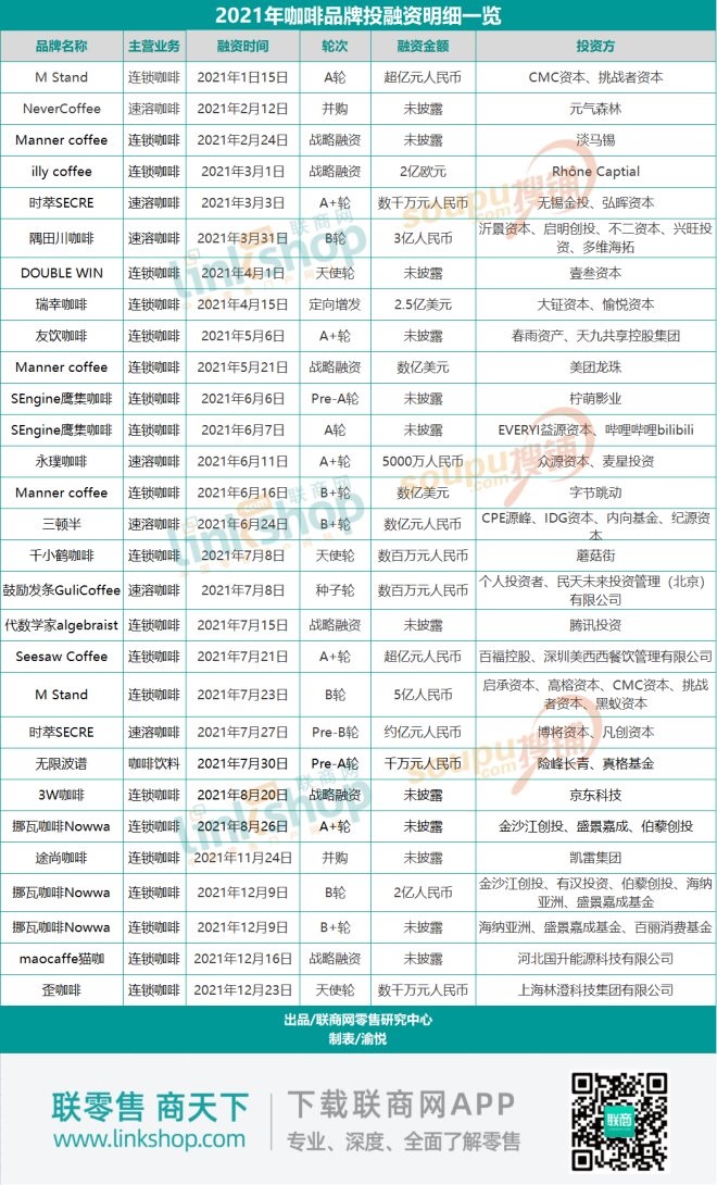 反觀咖啡市場,據(jù)聯(lián)商網(wǎng)不完全統(tǒng)計,在2021年共發(fā)生融資事件29起,涉及品牌有24家。