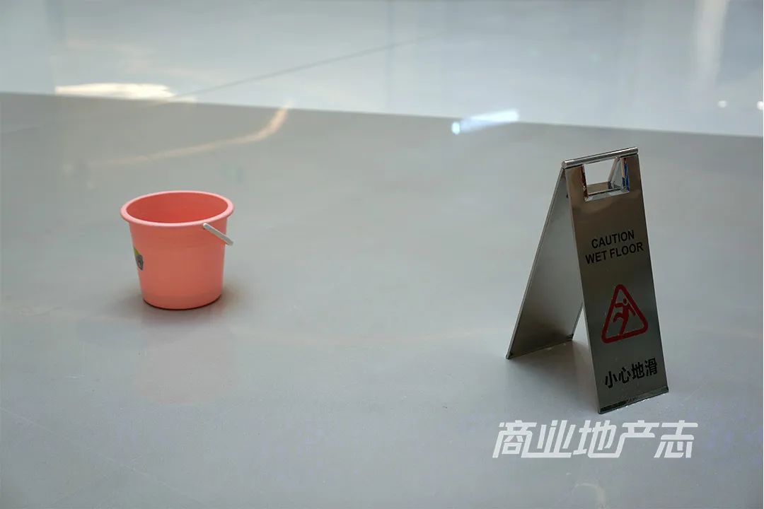 比如,造訪當日是雨天,剛走進項目一樓,就看到空蕩的中庭放著一個告示牌和一只水桶,因為中庭天花板在漏水????