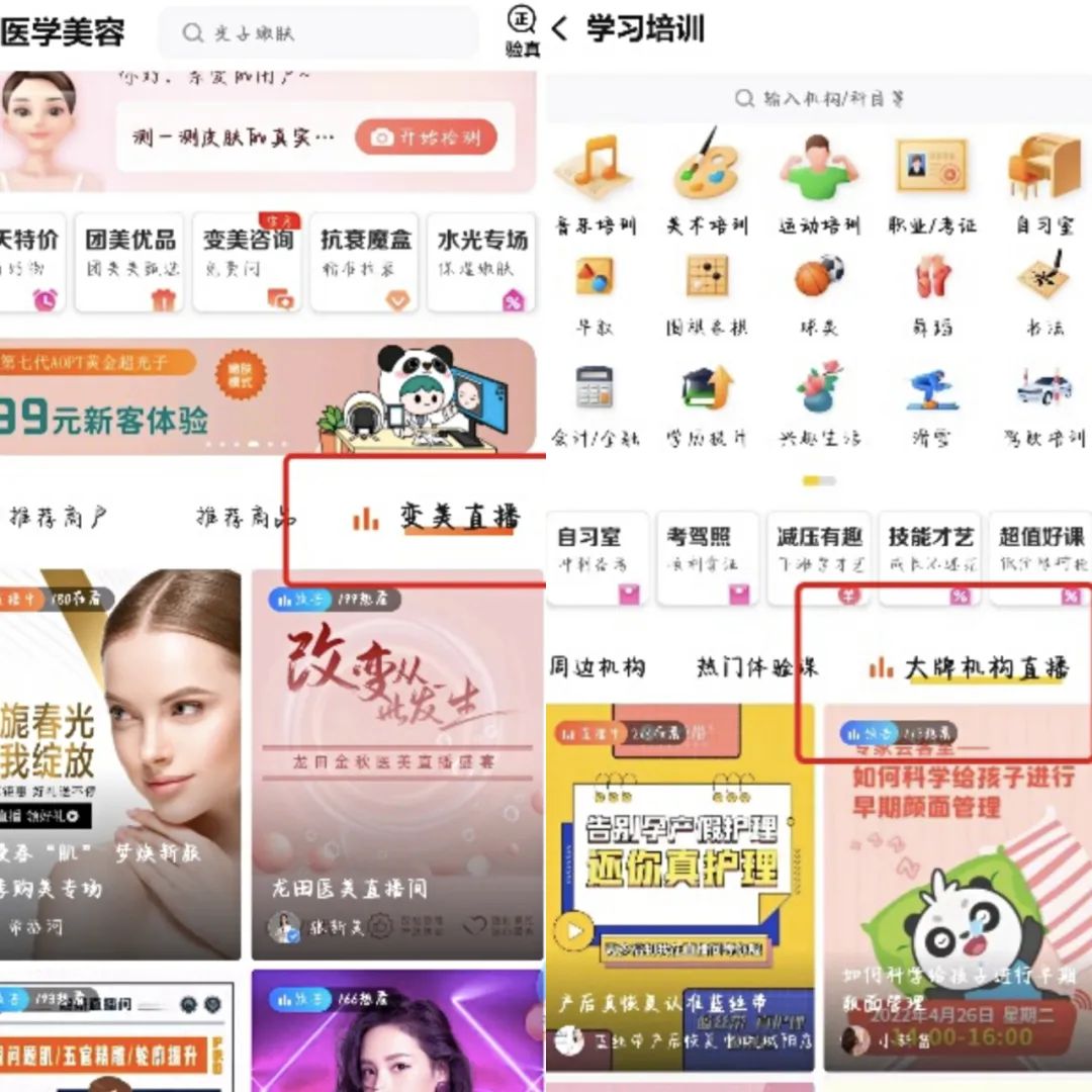 雖然已經宣布正式入局直播兩年多,但打開美團App會發(fā)現(xiàn),直播在美團App中至今沒有一個獨立的入口。之前隱匿在“景點/門票”之下的“旅行直播”已經不見蹤影,只有在“醫(yī)療/牙科”類目之下還有一個“名醫(yī)直播”入口,在“醫(yī)學美容”類目下有一“變美直播”。此外,在“學習培訓”類目下還有一個“大牌機構直播”,從內容里看,類似于過去的“袋鼠直播”。