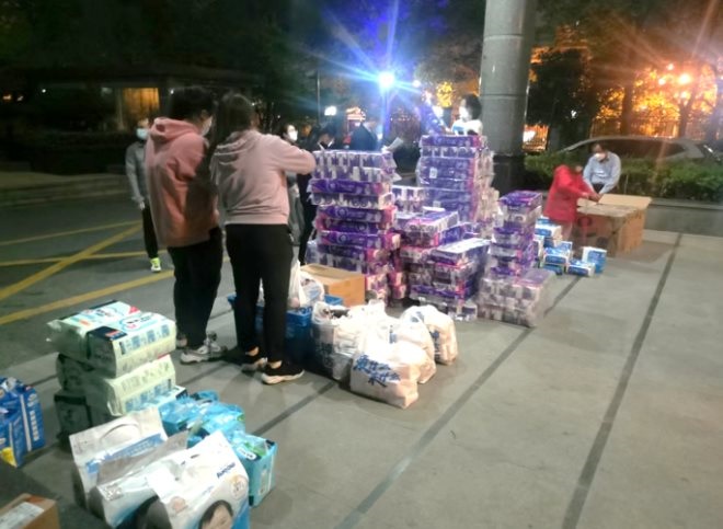 (圖:左鵬所在小區(qū) 家樂福物資運(yùn)抵后物品進(jìn)行分發(fā)中)