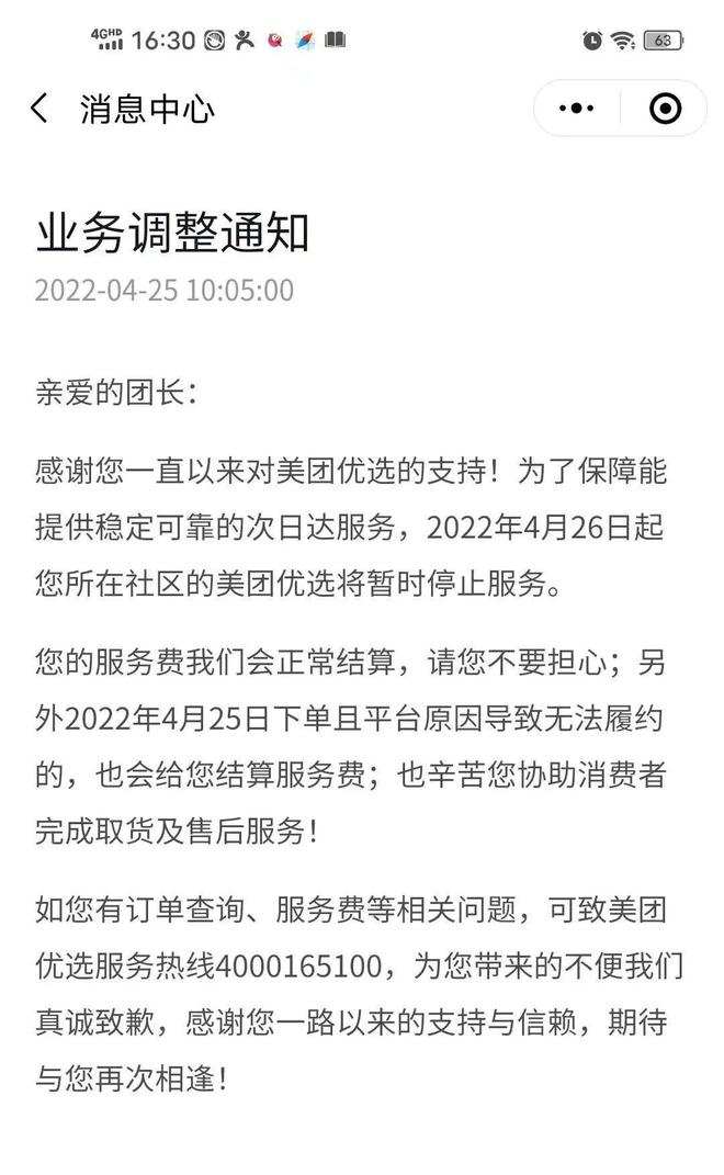 美團(tuán)優(yōu)選北京地區(qū)服務(wù)暫停通知