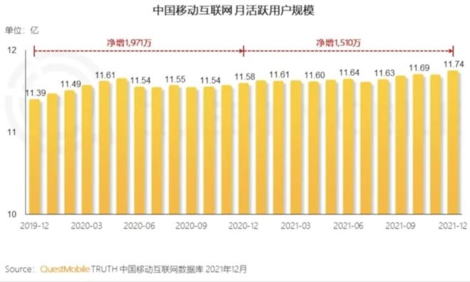 QuestMobile數(shù)據(jù)顯示,2019年12月到2021年12月,長達兩年的時間里移動互聯(lián)網(wǎng)月活用戶從11.39億人增長到11.74億人,漲幅僅為3%,且從月活用戶規(guī)模來看,較中國人口總數(shù)14.1億人口已經(jīng)沒有再多的上升空間。毋庸置疑,移動互聯(lián)網(wǎng)月活用戶的人口紅利幾乎觸碰到了天花板。