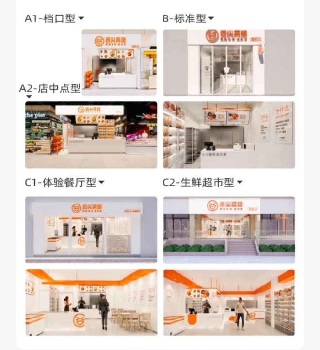 在APP上,“舌尖英雄”發(fā)布了一則合作伙伴計劃。其中,就介紹到其目前的門店類型!吧嗉庥⑿邸钡拈T店面積在8~60平方米,其中A類門店包括店中店、檔口店,最小僅需8平米,投資金額3萬起;B類標(biāo)準(zhǔn)店在20平方米左右,投資金額5萬起;C類門店則包括體驗餐廳型、生鮮超市型,面積在60平米以上,投資金額11萬起。