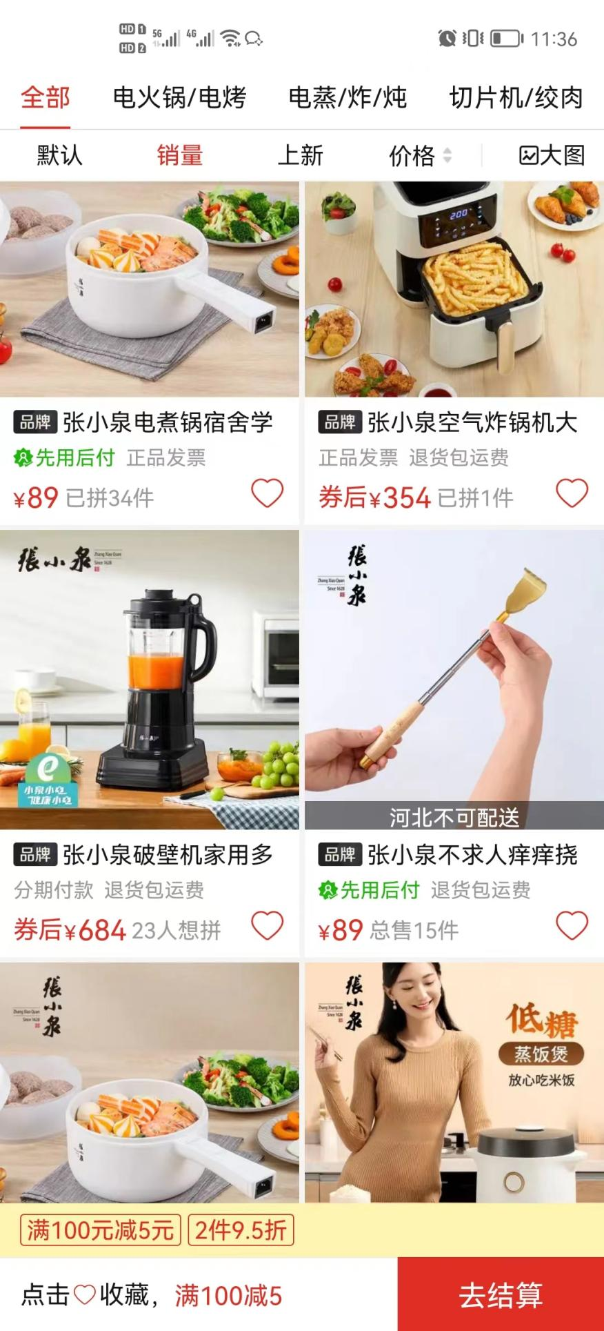 而張小泉的天貓旗艦店上,與刀剪產(chǎn)品動輒幾千上萬的月銷量相比,廚電的雙位數(shù)甚至是個位數(shù)銷量顯得寒酸無比。在拼多多的張小泉旗艦店,按照銷量排行中我們幾乎鮮能看到廚電產(chǎn)品的影子?烤珳(zhǔn)篩選之后,發(fā)現(xiàn)的8款電器產(chǎn)品,銷量最高的的為電煮鍋,拼售數(shù)量為34件。