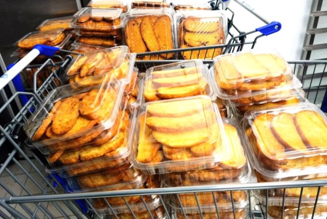 (圖:家樂福會(huì)員店購(gòu)物車中已經(jīng)烤制好的面包,正待打包分揀配送)