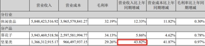 按產(chǎn)品分類,洽洽2021年葵花子營收39.43億元,同比增長5.86%;堅果類實現(xiàn)收入13.66億元,同比增長43.82%;其它實現(xiàn)收入6.75億元,同比增長9.94%。