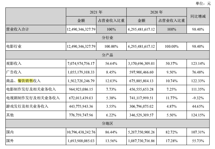 2021年報(bào)顯示,萬達(dá)電影院線收入超70億,占到總營收比例56.64%,但毛利率僅僅只有4.87%;反而是商品、餐飲的銷售收入雖然只有15億,但占總營收比例12.03%,毛利率更是達(dá)到了63.49%。