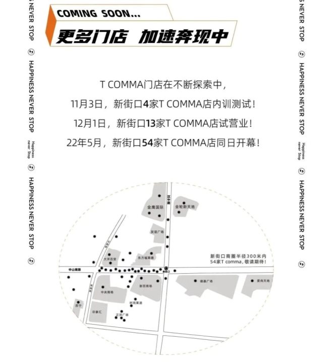 據(jù)T COMMA公眾號顯示,2021年11月3日,新街口4家T COMMA門店進行內訓測試;2021年12月1日,新街口13家T COMMA門店試營業(yè);2022年5月,新街口54家T COMMA門店將同日開幕。