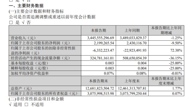 報告期內(nèi),中百集團實現(xiàn)營收34.46億元,同比下降1.25%;歸屬上市公司股東的凈利潤219.93萬元,同比下降9.50%;基本每股收益0.003元。