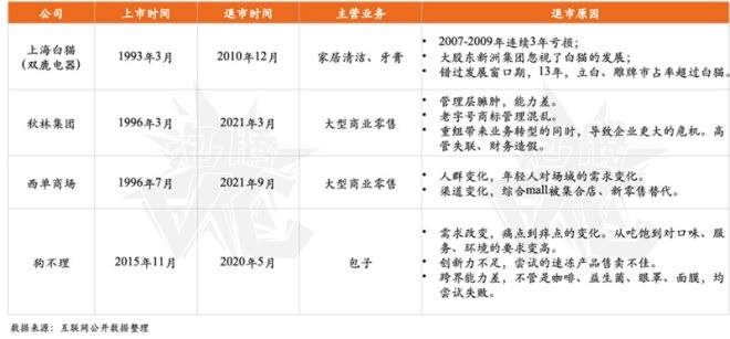 前有上海白貓因經(jīng)營不善,連續(xù)3年虧損而黯然退市;大型綜合商業(yè)零售中心秋林集團(tuán)、西單商場也逐漸被集合店、新零售替代,在2021年無奈提交了終止上市申請;就連名噪一時(shí)的狗不理包子也難以對抗時(shí)代的潮水,高價(jià)包子頻遭詬病,上市不足五年便終止了股票掛牌……