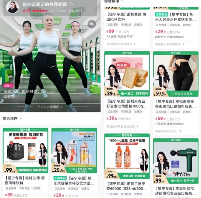在貓寧的抖音櫥窗,涵蓋健身鞋服、器械、食品飲料等18件商品,累計銷量已達10萬+,其中,一款單價99元的風(fēng)味飲料銷售量達3.8萬。