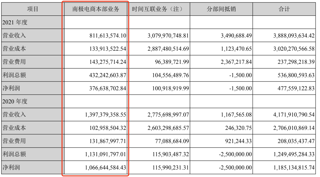 南極電商2021年營業(yè)收入38.88億元,其中本部營業(yè)收入8.08億元,同比下降42.12%;時間互聯(lián)營業(yè)收入30.8億元,同比增長10.96%。2022年第一季度總營業(yè)收入9.46億元,公司本部營業(yè)收入1.53億元,同比下降0.09%;時間互聯(lián)營業(yè)收入7.93億元,同比增長20.25%。