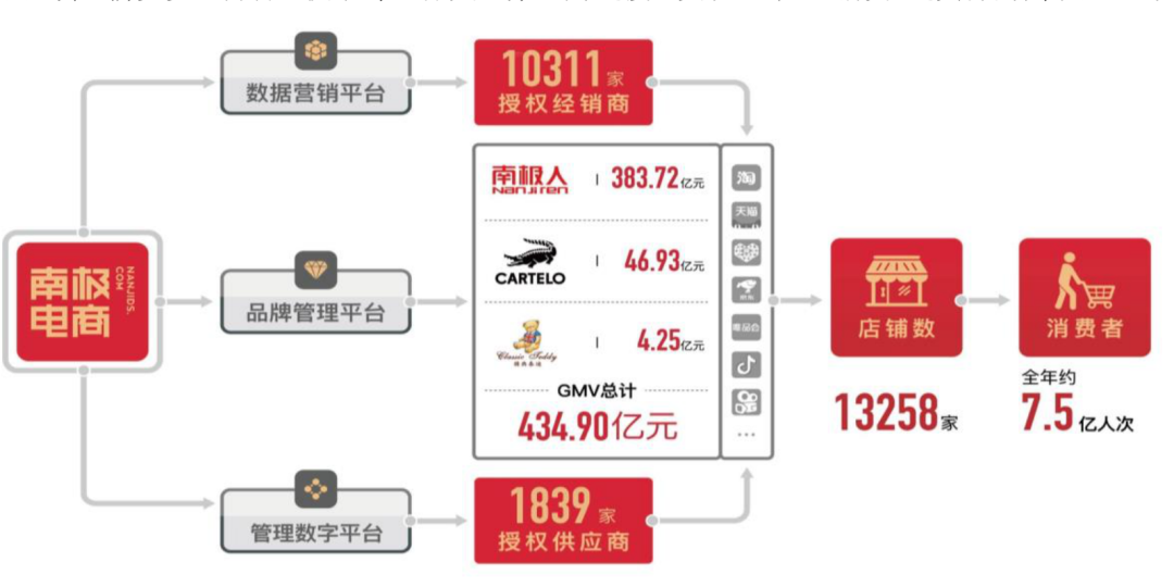 第二種,品牌綜合服務(wù),南極人不僅把品牌授權(quán)加盟商使用,還能進(jìn)行電商店鋪代運營,南極人賺品牌授權(quán)費的同時,還會從GMV中提取3%—6%的提成。