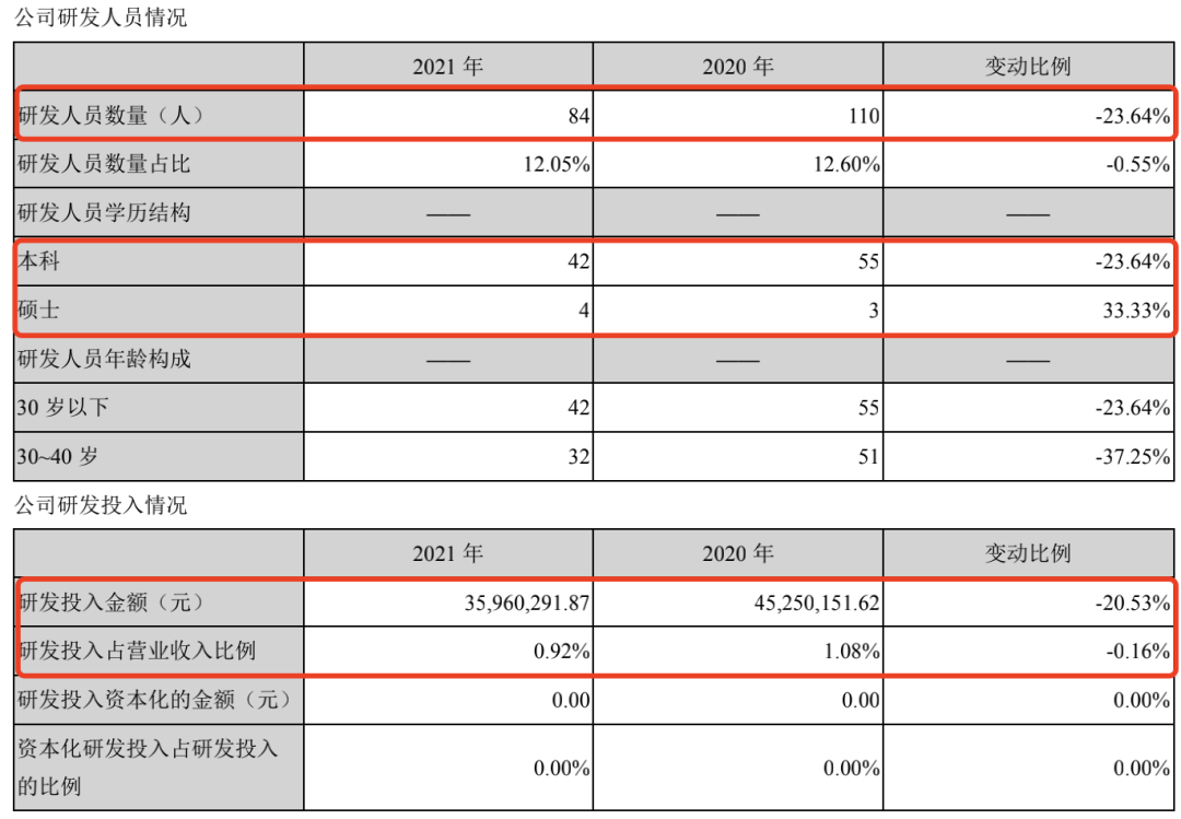 再看研發(fā)團(tuán)隊,2021年總共才84人,竟然還比上一年減少了26人,而產(chǎn)品研發(fā)人員中擁有本科以上學(xué)歷的占比,僅僅54.8%。很難想象,如此不重視研發(fā)創(chuàng)新的南極人,是如何保持其產(chǎn)品具備市場競爭力的?