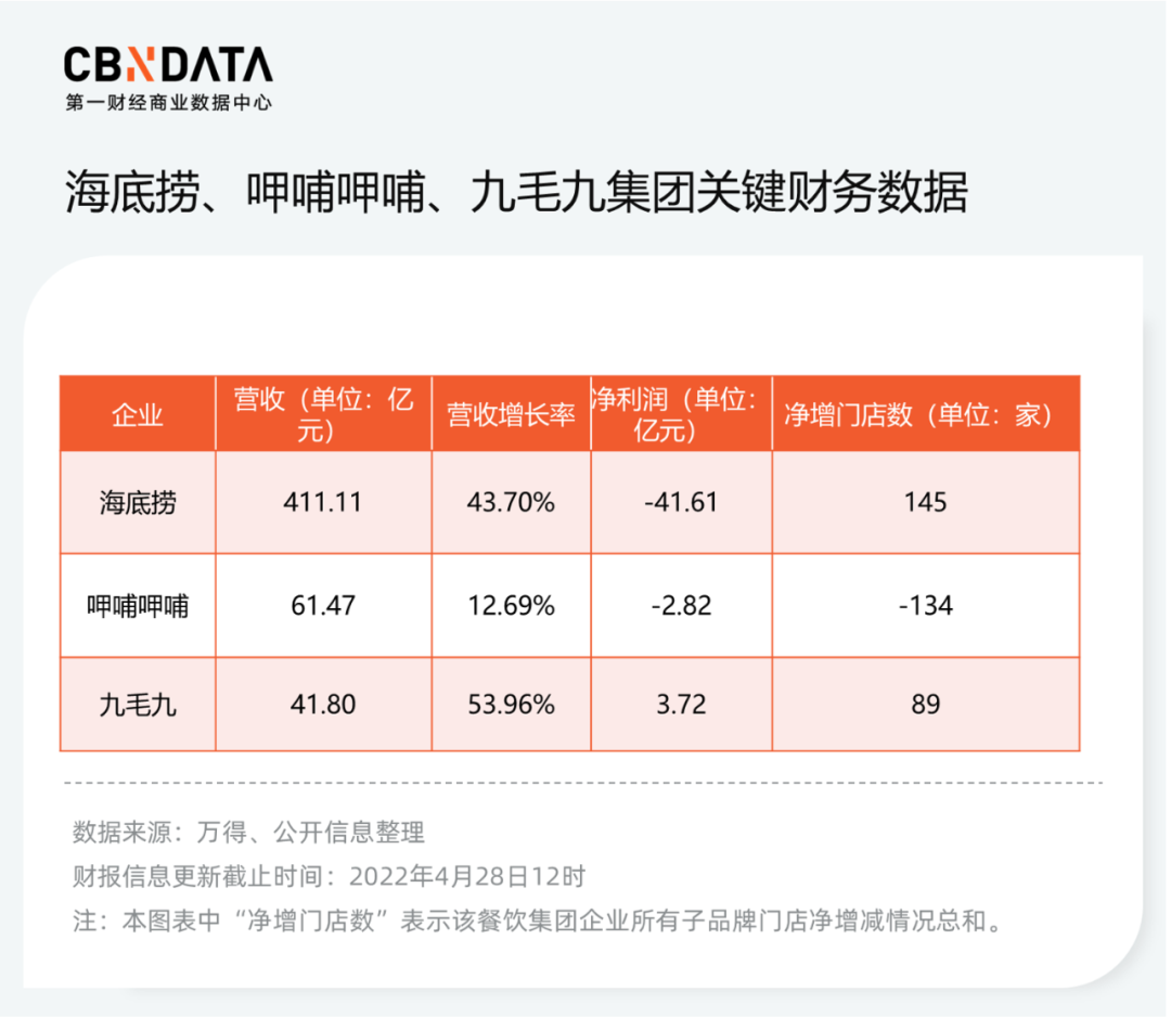 整體來(lái)看,三大集團(tuán)的營(yíng)收普漲,但海底撈卻在營(yíng)收增長(zhǎng)43.7%的情況下,凈虧損超40億元。相對(duì)來(lái)說(shuō),呷哺呷哺凈虧損數(shù)額相對(duì)較小,但值得注意的是,這是呷哺呷哺2014年上市以來(lái)首次錄得全年虧損。而另外一家九毛九關(guān)鍵數(shù)據(jù)相對(duì)好看一些,凈利潤(rùn)和營(yíng)收都保持了正增長(zhǎng)。