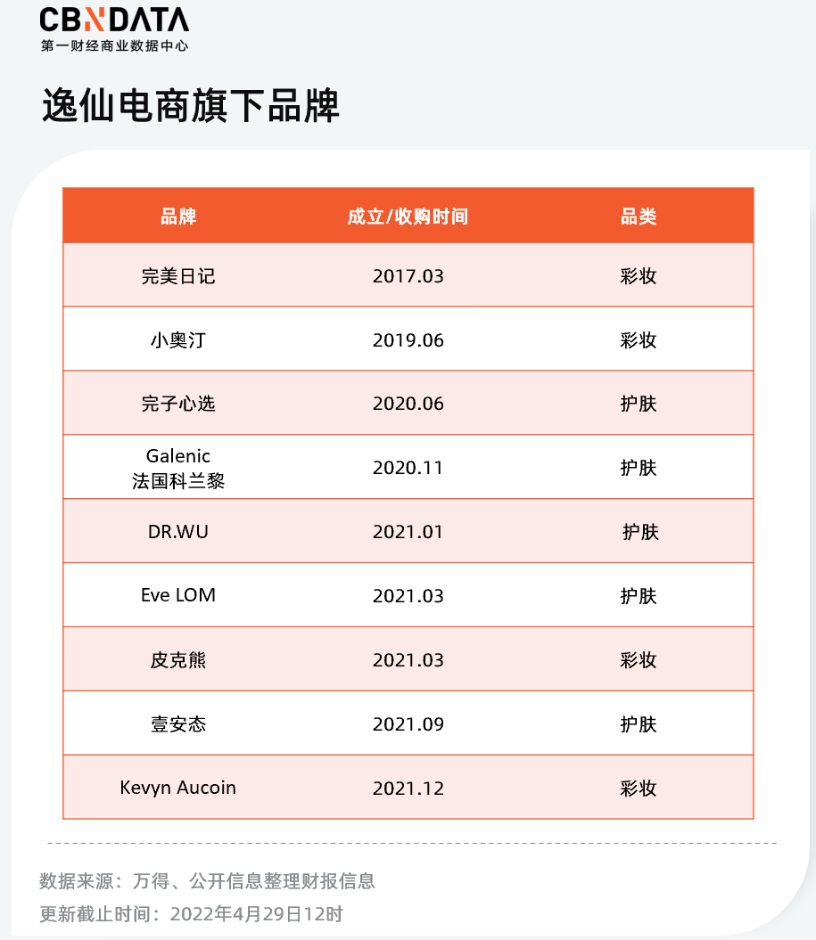 2020年逸仙電商自主孵化了護(hù)膚品牌“完子心選”,2020年11月,逸仙收購(gòu)法國(guó)高端美妝品牌“Galénic”,此后又陸續(xù)收購(gòu)了科蘭黎、DR.WU的大陸業(yè)務(wù)等。截至目前,逸仙電商旗下已經(jīng)有了完美日記、小奧汀、完子心選、Galénic法國(guó)科蘭黎、DR.WU(中國(guó)大陸業(yè)務(wù))、Eve LOM、Kevyn Aucoin、皮克熊和壹安態(tài)九大品牌,從國(guó)貨到國(guó)際,從彩妝到護(hù)膚,逸仙電商覆蓋了從大眾到中高端的各個(gè)品類。