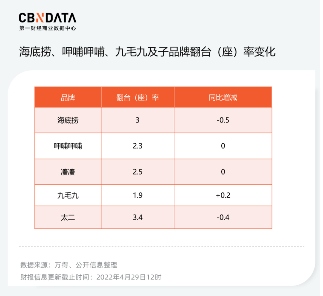 但對(duì)于海底撈來(lái)說(shuō),這次翻臺(tái)率的下降就沒有可以彌補(bǔ)的余地了。平均每天3次的翻臺(tái)率,是近5年來(lái)的最低水平。
