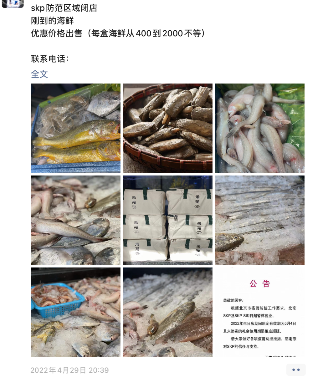 同樣做法的不少。SKP是更早幾天被封的。有一家叫臺(tái)州魚市的餐廳,因?yàn)镾KP受疫情影響突然被封,導(dǎo)致剛到的海鮮“無處安放”,店長在朋友圈“吆喝”賣起了魚,在他們的公眾號“禾苑”里甚至還給出了一些食材的做法。