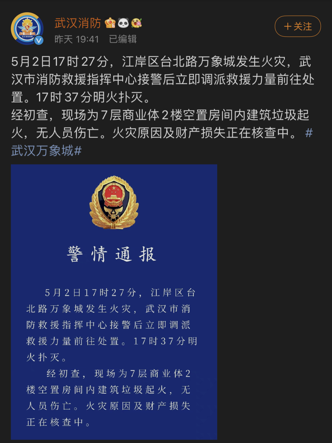 有意思的是,就在我們組稿的同時,開業(yè)第二天(5月2日)的武漢萬象城就迎來了119消防車的到來,事故發(fā)生后不久,武漢消防官方也出了相關(guān)聲明????