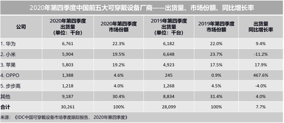 另一個(gè)潛力較大的領(lǐng)域是可穿戴設(shè)備。IDC數(shù)據(jù)顯示,截至2020年第四季度,OPPO在可穿戴設(shè)備市場(chǎng)以4.6%的份額排在第四位,與第一名華為存在17.7個(gè)百分點(diǎn)的差距。反映到出貨量上,華為約是OPPO的5倍。