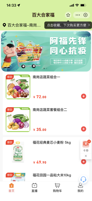 面對突發(fā)的疫情,百大合家福攜手中皖知托付一起,共同展開了“阿福先鋒,同心抗疫”行動,借助京東到家、餓了么、美團等線上平臺為市民展開了豐富的商品供應(yīng);同時,通過小程序為顧客提供不同種類的“生鮮組合套餐”,及時滿足疫情期間百姓的物資購買需求。顧客進入線上平臺和小程序時,即可輕松購買到各類米、面、糧、油、肉、蛋、菜、奶及防疫清潔等優(yōu)質(zhì)日用商品。