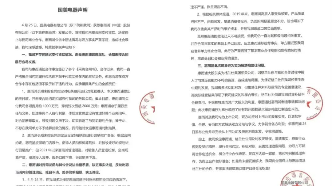最近家電圈的一個糾紛得到了業(yè)內(nèi)外關(guān)注。知名白電制造商惠而浦發(fā)布公告稱,因國美電器長期拖欠貨款并且情況持續(xù)延遲惡化,公司決定即日起終止與國美電器的商務(wù)合作。另一方面,4月26日早間,國美電器發(fā)布聲明回應(yīng)稱,公司不存在延遲支付貨款情況,是惠而浦方面長期未按合同履行義務(wù)。