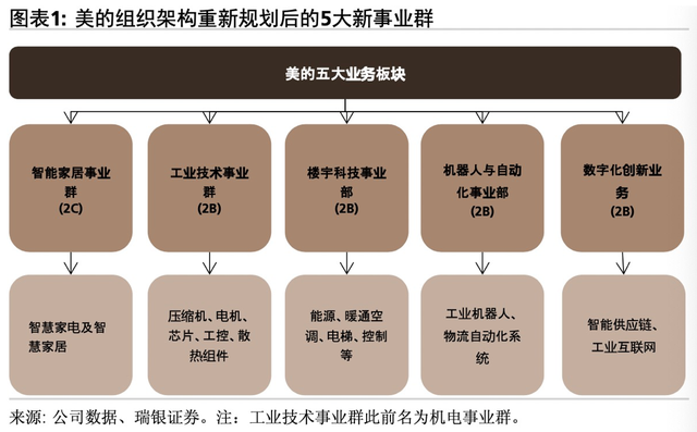 從美的最新財報看,美的構建了智能家居事業(yè)群、工業(yè)技術事業(yè)群、樓宇科技事業(yè)部、機器人與自動化事業(yè)部和數(shù)字化創(chuàng)新業(yè)務五大業(yè)務板塊。