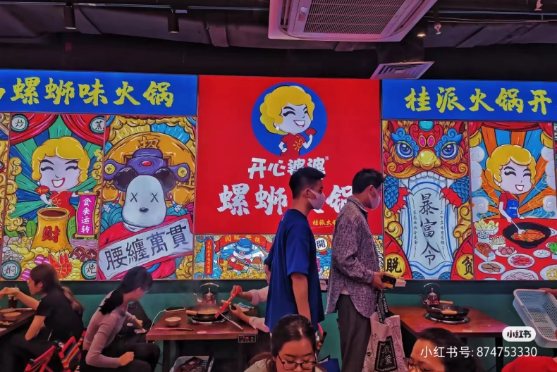 開心婆婆螺螄火鍋,自稱“桂派火鍋開創(chuàng)者”,這個名號挺大,但顧客卻不沖這個來,更多的是沖“國潮風”、“地攤感”、“有氛圍”、“味道好”去打卡。