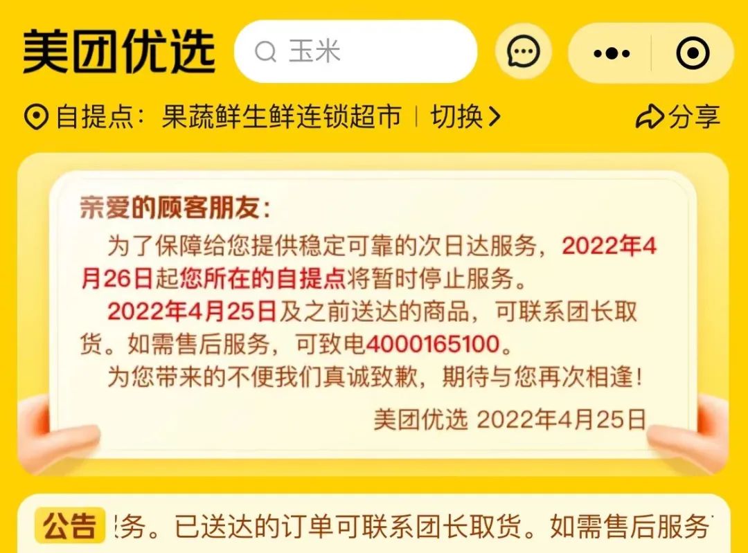 4月20日,美團(tuán)優(yōu)選相繼退出新疆、甘肅、青海、寧夏四個(gè)省份。4月25日,美團(tuán)優(yōu)選發(fā)布公告,北京自提點(diǎn)將于4月26日暫停服務(wù)。