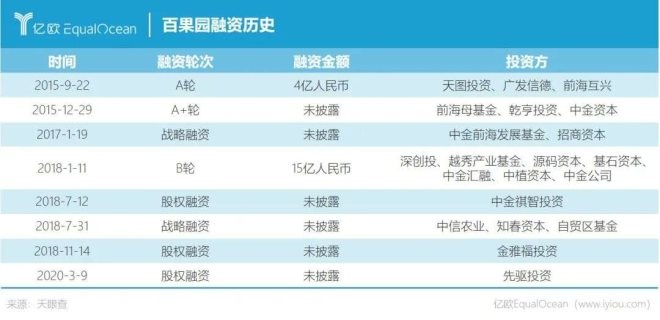 百果園的野心不止于此,2015年起開始引入外部投資。2015年9月,百果園完成4億元A輪融資,由天圖投資領(lǐng)投,廣發(fā)信德、前;ヅd等機(jī)構(gòu)跟投,創(chuàng)下彼時水果零售行業(yè)最高融資紀(jì)錄。2018年,百果園又完成了高達(dá)15億元的B輪融資。