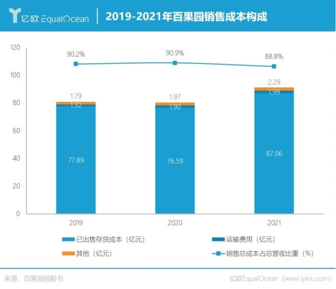 2019-2021年,百果園的銷售總成本分別高達(dá)81.00億元、80.46億元和91.33億元,占總營收的90.2%、90.9%和88.8%。其中,已出售存貨成本分別占銷售成本的96.2%、95.2%及95.3%,運(yùn)輸費(fèi)用分別占銷售成本的1.6%、2.4%和2.2%。