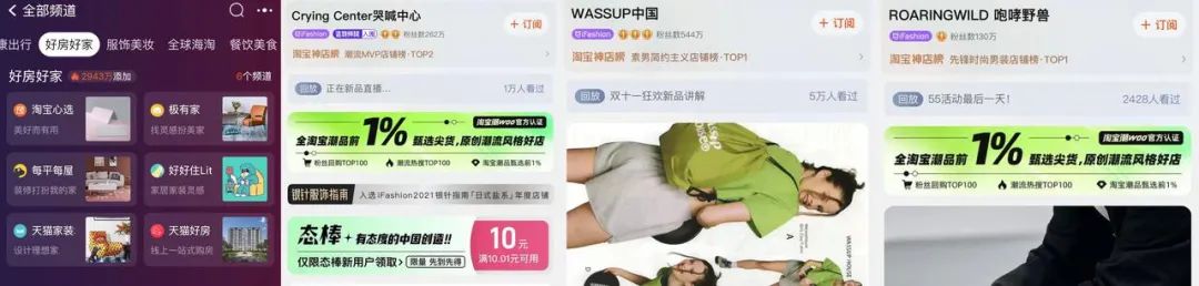 比如阿里今年推出的屋顏主打高端家具電商,而居家一直都是淘寶中的重點板塊,淘寶上的好房好家頻道就涵蓋了家具、裝修、房子種草等商品和服務。新的潮流電商產(chǎn)品態(tài)棒中出現(xiàn)的哭喊中心、WASSUP中國、咆哮野獸等國潮品牌也都是淘寶五年以上的老店。