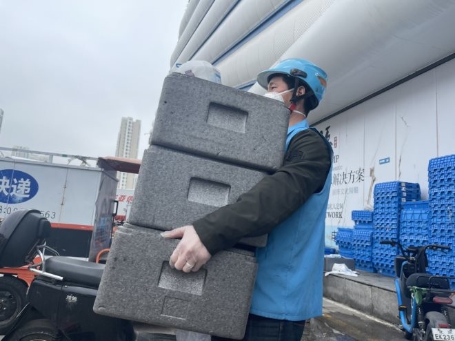 “過去一趟送1-2單,現(xiàn)在采用集單模式一次最多送30多個訂單,運送效率大大提高。在運力上,也會根據(jù)社區(qū)狀態(tài)向臨時管控小區(qū)傾斜!焙旭R十里河店配送員介紹,一輛車就能送一個小區(qū)的訂單。揀貨、分裝、消殺、打包等多個環(huán)節(jié),大大提高了服務能力和效率。