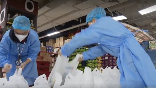 (圖:家樂福武漢援護(hù)團(tuán)隊(duì)領(lǐng)隊(duì)薛貝在上海中山公園店協(xié)助社區(qū)集單打包)