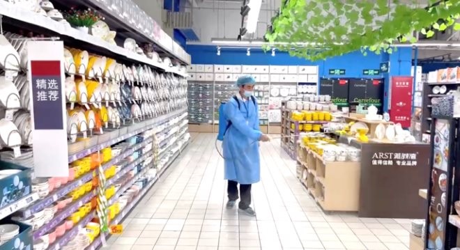 (圖:恢復(fù)線下營業(yè) 家樂福員工在門店內(nèi)進(jìn)行全面環(huán)境消殺)