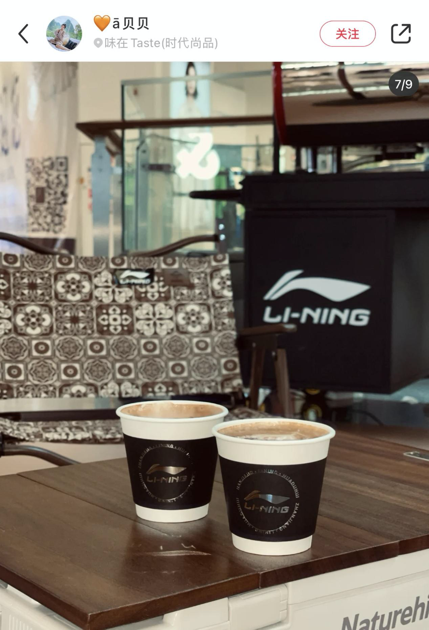 透過(guò)一位小紅書(shū)博主的打卡帖子,我們看到了寧咖啡的廬山真面目。今年2月初,她在廣東湛江市一家新開(kāi)的李寧專賣店門口,看到了標(biāo)有“LI-NING”標(biāo)識(shí)的咖啡小推車,車篷上印有李寧品牌logo和“X CAFE”的字樣。帖子中她提到,在李寧門店任意消費(fèi)都可以免費(fèi)喝一杯李寧咖啡,杯子的logo也是常見(jiàn)的李寧品牌樣式,很有氛圍感。