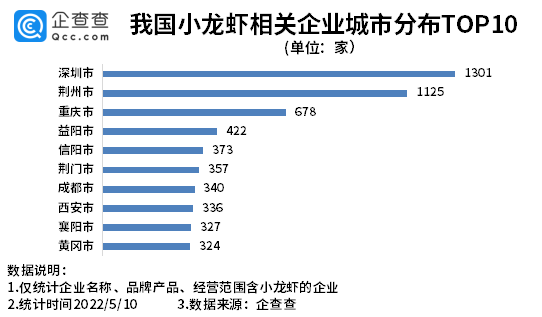 企查查數(shù)據(jù)顯示,從城市分布來看,深圳以1301家小龍蝦相關(guān)企業(yè)排名第一,荊州、重慶分別有小龍蝦相關(guān)企業(yè)1125家、678家,位列前三。湖北省除荊州外,荊門、襄陽、黃岡也位列前十。