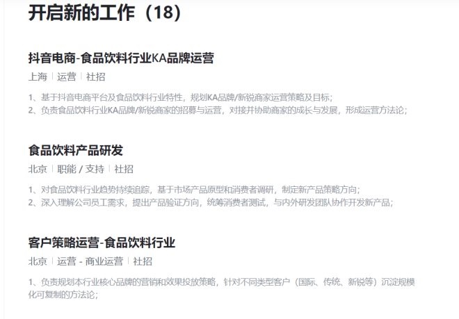 壹覽商業(yè)發(fā)現(xiàn),當(dāng)前字節(jié)跳動(dòng)在官網(wǎng)招聘欄目中,已有包括食品飲料產(chǎn)品研發(fā)和策劃等崗位。