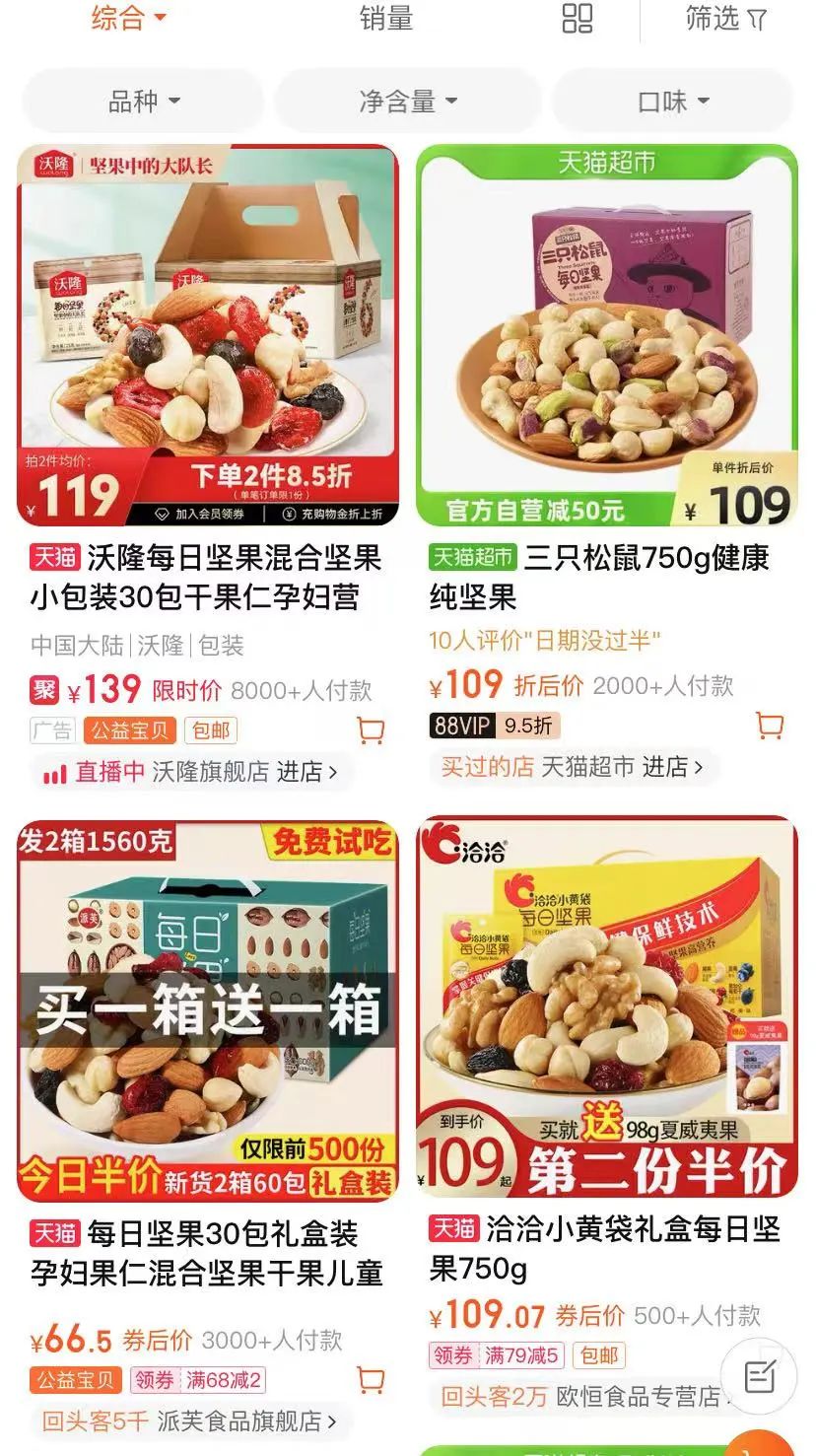 以三只松鼠的“每日堅果”為例,產品面世時價格在200-300元一箱,而如今價格已降至100元左右。而百草味的同類產品為70元左右,派芙為60元左右,隨著這一品類的產品增多,價格或許還將進一步下降。