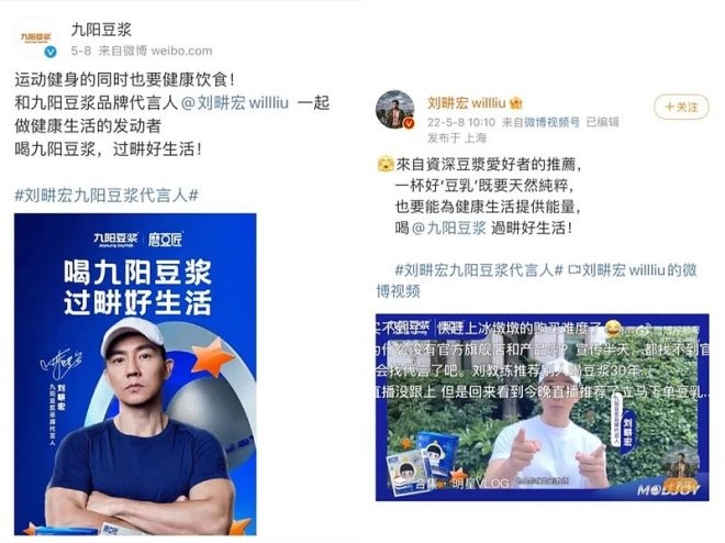 接著是5月8日劉畊宏與九陽豆?jié){在同一時(shí)間官宣代言合作。至此,劉畊宏是否已全面開啟商業(yè)化成為被熱議的話題。