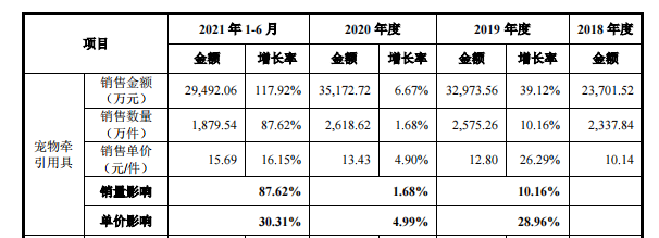 此前源飛寵物官網(wǎng)中宣稱,公司“年生產(chǎn)狗咬膠700萬公斤”,“年生產(chǎn)寵物牽引帶5000萬條”。根據(jù)源飛寵物披露,2018年至2021年上半年,寵物牽引用具的平均單價由10.14元漲至15.69元。