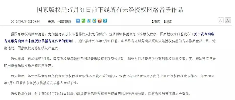 2015年7月8日,國家版權(quán)局下發(fā)《關(guān)于責(zé)令網(wǎng)絡(luò)音樂服務(wù)商停止未經(jīng)授權(quán)傳播音樂作品的通知》,要求各網(wǎng)絡(luò)音樂服務(wù)商在7月31日前將未經(jīng)授權(quán)傳播的音樂作品全部下線。這一通知,后來被業(yè)內(nèi)稱為“最嚴(yán)版權(quán)令”。
