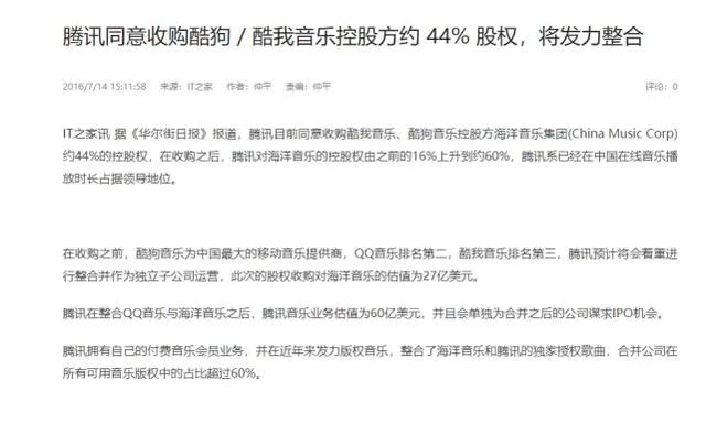 而騰訊旗下QQ音樂,同樣從2012年開始,就以“版權(quán)商人”的布局眼光,大量購入獨家版權(quán)。2016年7月,酷我、酷狗、QQ音樂等合并成為騰訊音樂娛樂集團,本質(zhì)上是一場“版權(quán)大戶”的聯(lián)歡。