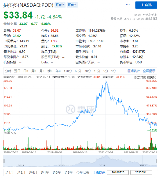 據(jù)雪球網(wǎng)顯示,拼多多自去年2月份股價(jià)到達(dá)頂峰之后,就一直下跌,目前市值僅在430億美元左右。