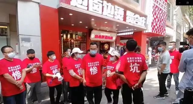 來自全國各地的諸多加盟商,到賢合莊的總部所在地——成都進(jìn)行維權(quán)。加盟商們穿著統(tǒng)一的紅色T恤,上面印著白字“賢某莊加盟商全國守法維權(quán)”,正中是一個(gè)大大的“慘”或“坑”字。