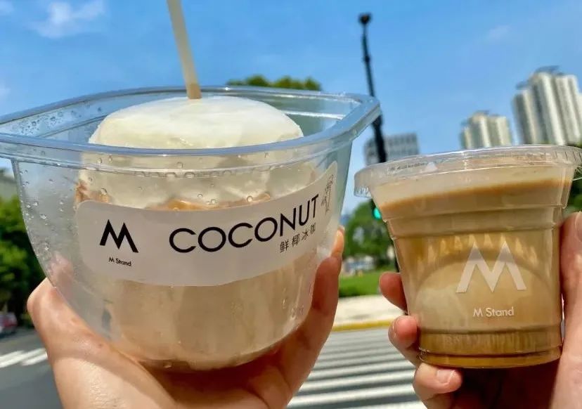 新鮮椰青,也就是商超常見的白色椰子蛋,通常需要店員現(xiàn)場開椰,不少門店將其作為售賣特色。比如M stand推出“整顆椰子蛋咖啡”,在新鮮椰子蛋中注入咖啡液,一度火爆全網(wǎng)。