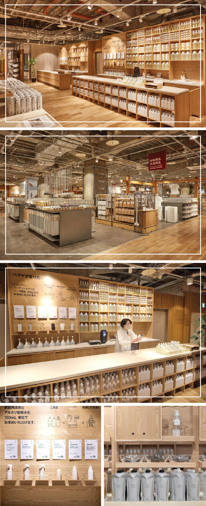 廣島縣在去年6月發(fā)表環(huán)境宣言,提出到2050年實現(xiàn)瀨戶內(nèi)海的海洋塑料零污染。在這一背景下,無印良品的日用品采用環(huán)保無包裝的稱重售賣方式,洗衣液、洗手液、沐浴露、洗發(fā)護發(fā)用品等都可按需購買。稱重式售賣的洗發(fā)護發(fā)用品是無印良品的新商品,共投入了10個單品。顧客可自帶容器,100克起賣。