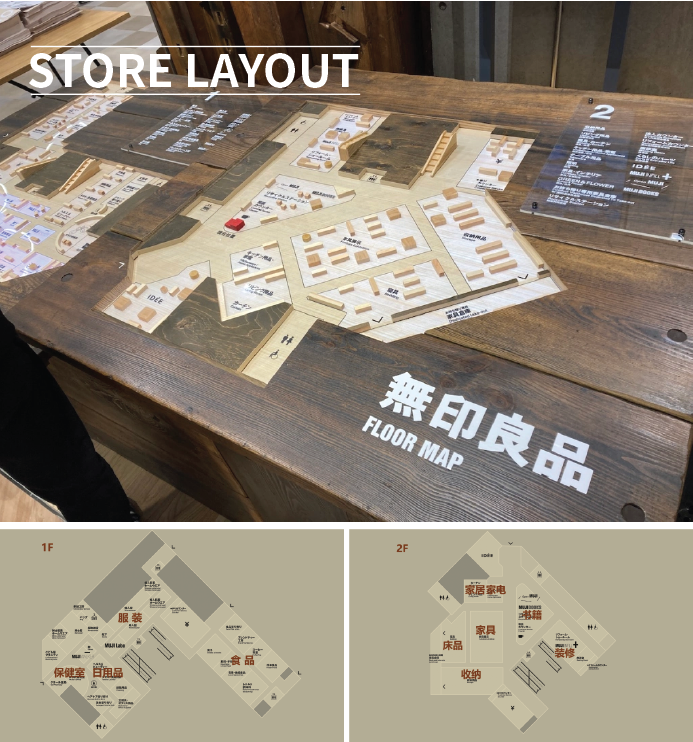 該店分上下兩層,一層分類主要包括食品、服裝、日用品和保健室等;二層包括家具、家居、家電、收納、書籍、裝修樣板間等。無印良品用木材雕刻了賣場布局展示圖,突出廣島作為木材產(chǎn)地的地域特征。
